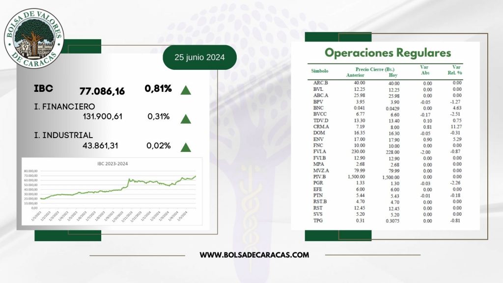 El índice principal de la Bolsa de Valores de Caracas, el IBC, culminó este martes en 77.083,16 puntos con una variación de 619,82 puntos (+0,81%), con respecto a la sesión anterior.