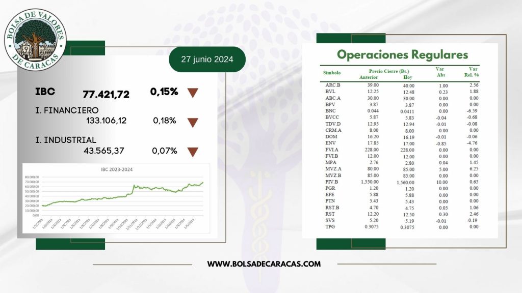 El índice principal de la Bolsa de Valores de Caracas, el IBC, culminó este jueves en 77.421,72 puntos con una variación de 116,71 puntos (-0,15%), con respecto a la sesión anterior.