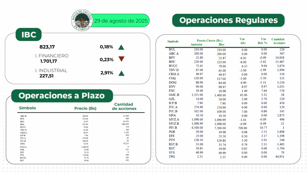 El índice principal de la Bolsa de Valores de Caracas, el IBC, culminó este viernes en 823,17 puntos con una variación de 1,52 puntos (+0,18%), con respecto a la sesión anterior.