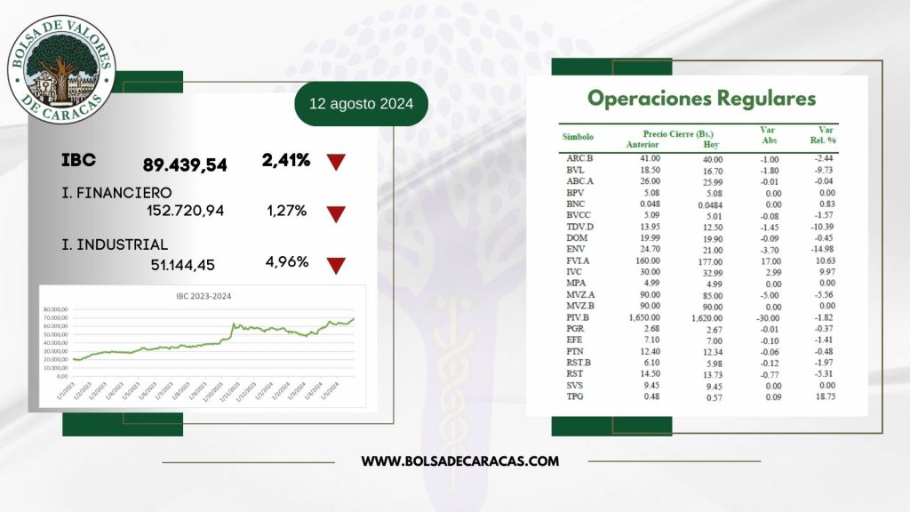 El índice principal de la Bolsa de Valores de Caracas, el IBC, culminó este lunes en 89.439,54 puntos con una variación de 2.208,72 puntos (-2,41%), con respecto a la sesión anterior.