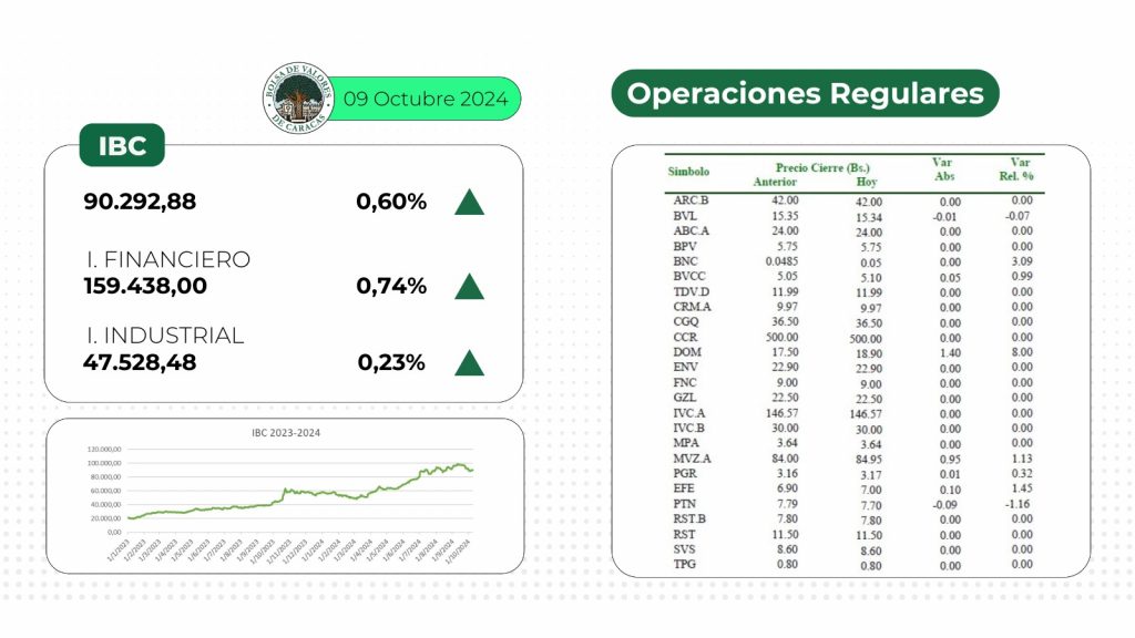 El índice principal de la Bolsa de Valores de Caracas, el IBC, culminó este miércoles en 90.292,88 puntos con una variación de 538,56 puntos (+0,60%), con respecto a la sesión anterior.