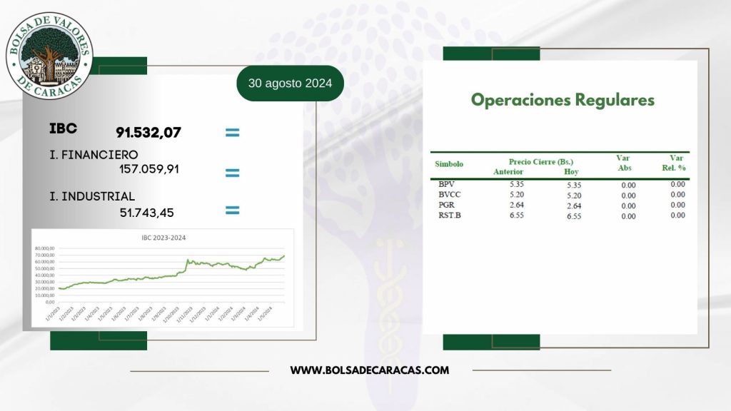 El índice principal de la Bolsa de Valores de Caracas, el IBC, culminó este viernes en 91.532,07 puntos; el Índice Financiero, en 157.059,91 puntos y el industrial, en 51.743,45, sin registrar variación con respecto a la jornada anterior.