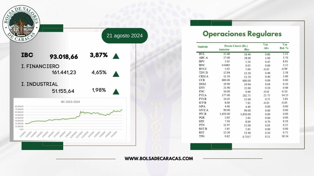 El índice principal de la Bolsa de Valores de Caracas, el IBC, culminó este miércoles en 93.018,66 puntos con una variación de 3.462,50 puntos (+3,87%), con respecto a la sesión anterior.
