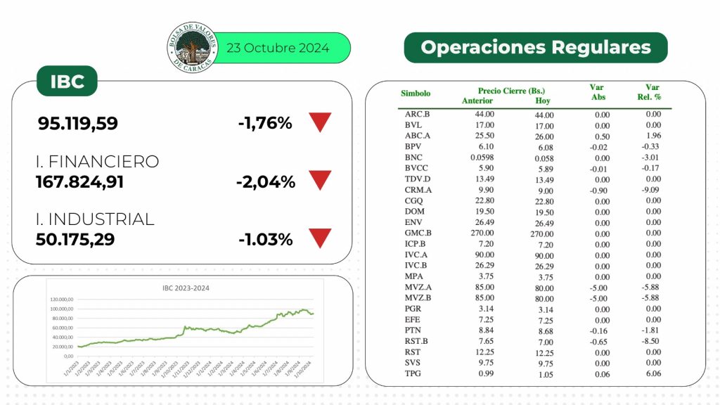 El índice principal de la Bolsa de Valores de Caracas, el IBC, culminó este miércoles en 95.119,59 puntos con una variación de 1.708,51 puntos (-1,76%), con respecto a la sesión anterior.