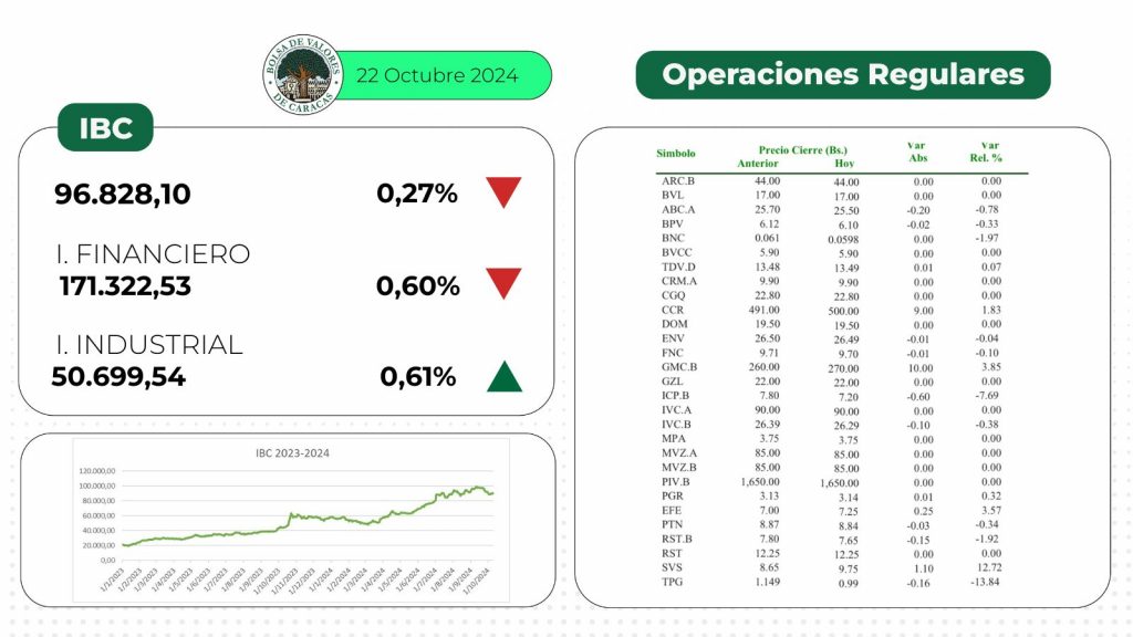 El índice principal de la Bolsa de Valores de Caracas, el IBC, culminó este martes en 96.828,10 puntos con una variación de 261,34 puntos (-0,27%), con respecto a la sesión anterior.