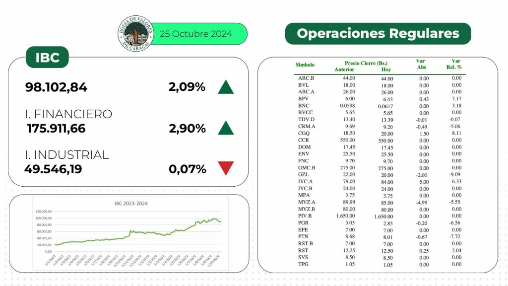 El índice principal de la Bolsa de Valores de Caracas, el IBC, culminó este viernes en 98.102,84 puntos con una variación de 2.012,58 puntos (+2,09%), con respecto a la sesión anterior.