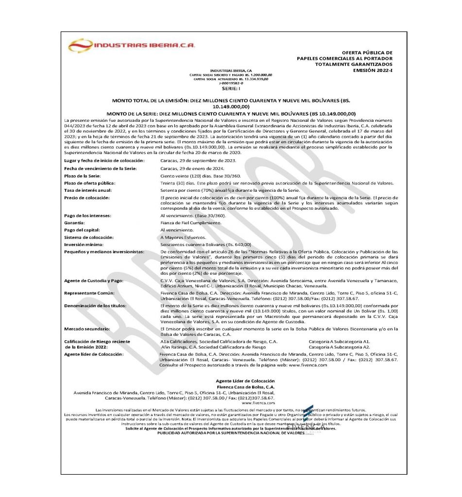 Los títulos para colocar son los correspondiente a la Serie I, de la Emisión 2022-I, de Papeles Comerciales al Portador, emitidos por la Empresa Emisora INDUSTRIAS IBERIA, C.A.