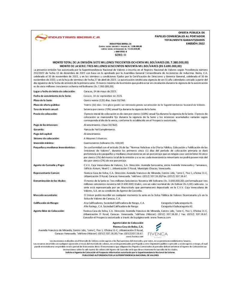 Los títulos para colocar son los correspondiente a la Serie III, de la Emisión 2022, de Papeles Comerciales al Portador, emitidos por la Empresa Emisora INDUSTRIAS IBERIA, C.A.