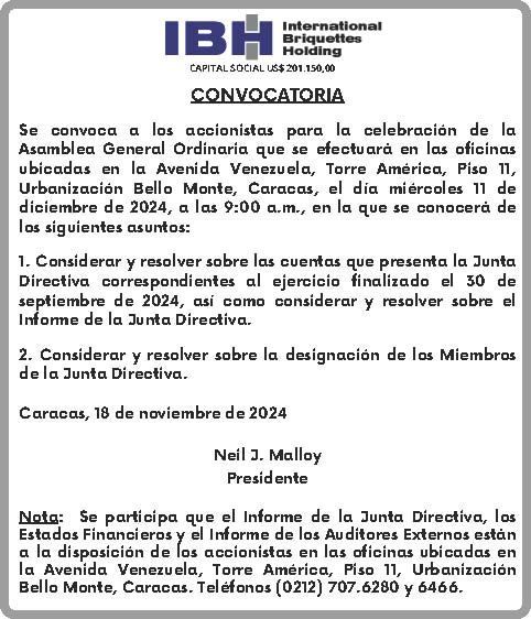 Se convoca a los accionistas para la celebración de la Asamblea General Ordinaria que se efectuará en las oficinas ubicadas en la Avenida Venezuela, Torre América, Piso 11, Urbanización Bello Monte de esta ciudad de Caracas, el día miércoles 11 de diciembre de 2024, a las 9:00 a.m., en la que se conocerá de los siguientes asuntos:
