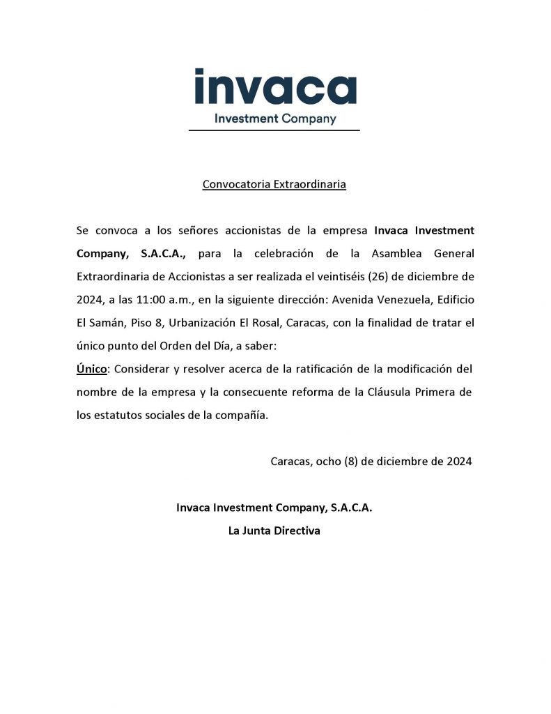 Se convoca a los señores accionistas de la empresa Invaca Investment Company, S.A.C.A., para la celebración de la Asamblea General Extraordinaria de Accionistas a ser realizada el veintiséis (26) de diciembre de 2024, a las 11:00 a.m., en la siguiente dirección: Avenida Venezuela, Edificio El Samán, Piso 8, Urbanización El Rosal, Caracas, con la finalidad de tratar el único punto del Orden del Día, a saber: