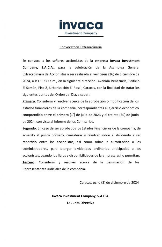 Se convoca a los señores accionistas de la empresa Invaca Investment Company, S.A.C.A., para la celebración de la Asamblea General Extraordinaria de Accionistas a ser realizada el veintiséis (26) de diciembre de 2024, a las 11:30 a.m., en la siguiente dirección: Avenida Venezuela, Edificio El Samán, Piso 8, Urbanización El Rosal, Caracas, con la finalidad de tratar los siguientes puntos del Orden del Día, a saber: