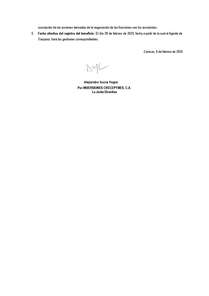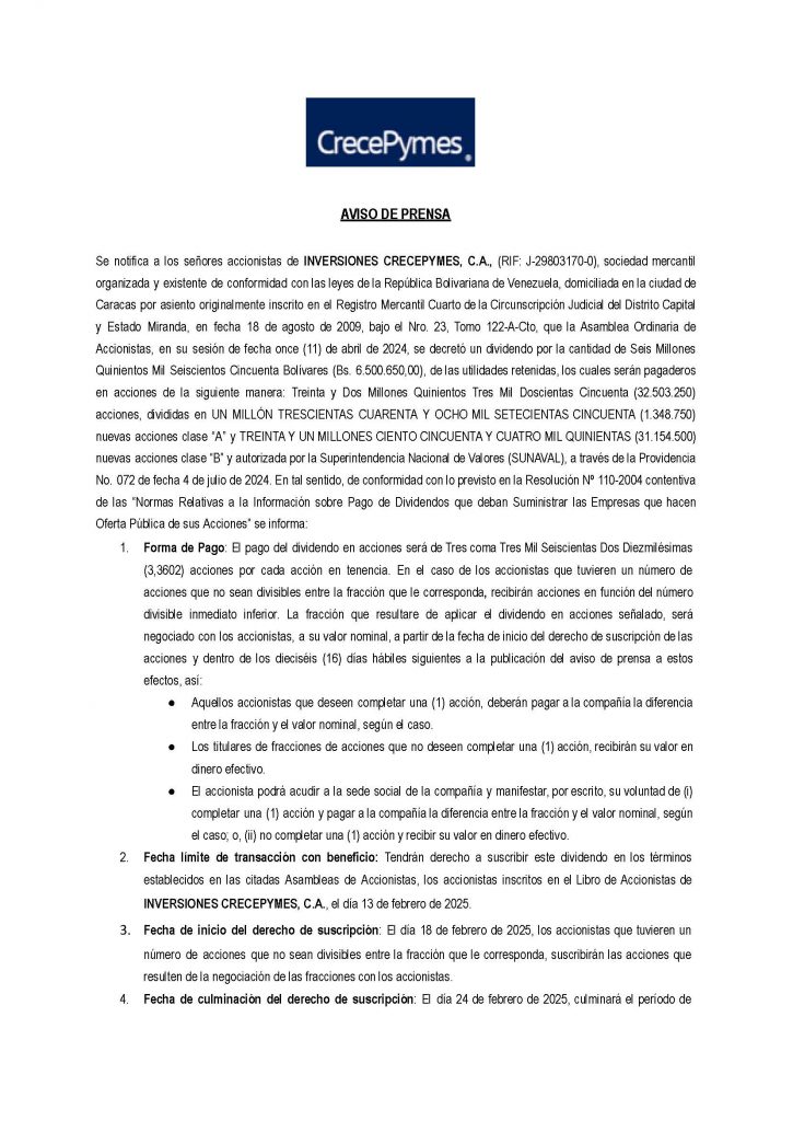 Se notifica a los señores accionistas de INVERSIONES CRECEPYMES, C.A., (RIF: J-29803170-0), sociedad mercantil organizada y existente de conformidad con las leyes de la República Bolivariana de Venezuela, domiciliada en la ciudad de Caracas por asiento originalmente inscrito en el Registro Mercantil Cuarto de la Circunscripción Judicial del Distrito Capital y Estado Miranda, en fecha 18 de agosto de 2009, bajo el Nro. 23, Tomo 122-A-Cto, que la Asamblea Ordinaria de Accionistas, en su sesión de fecha once (11) de abril de 2024, se decretó un dividendo por la cantidad de Seis Millones Quinientos Mil Seiscientos Cincuenta Bolívares (Bs. 6.500.650,00), de las utilidades retenidas, los cuales serán pagaderos en acciones de la siguiente manera: Treinta y Dos Millones Quinientos Tres Mil Doscientas Cincuenta (32.503.250) acciones, divididas en UN MILLÓN TRESCIENTAS CUARENTA Y OCHO MIL SETECIENTAS CINCUENTA (1.348.750) nuevas acciones clase “A” y TREINTA Y UN MILLONES CIENTO CINCUENTA Y CUATRO MIL QUINIENTAS (31.154.500) nuevas acciones clase “B” y autorizada por la Superintendencia Nacional de Valores (SUNAVAL), a través de la Providencia No. 072 de fecha 4 de julio de 2024. En tal sentido, de conformidad con lo previsto en la Resolución Nro.110-2004 contentiva de las “Normas Relativas a la Información sobre Pago de Dividendos que deban Suministrar las Empresas que hacen Oferta Pública de sus Acciones” se informa: