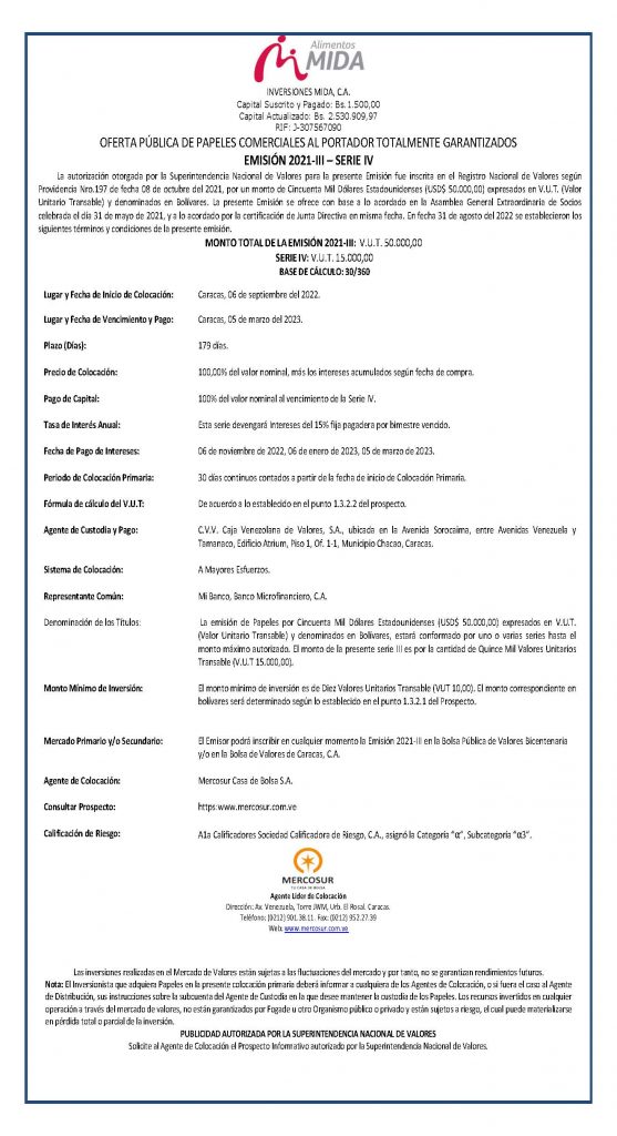 Los títulos para colocar son los correspondientes a la Serie IV, de la Emisión 2021-III, de Papeles Comerciales de INVERSIONES MIDA, C.A., por un monto de (USD$. 15.000,00), de dólares de los Estados Unidos de América, expresados en V.U.T. (Valor Unitario Transable).