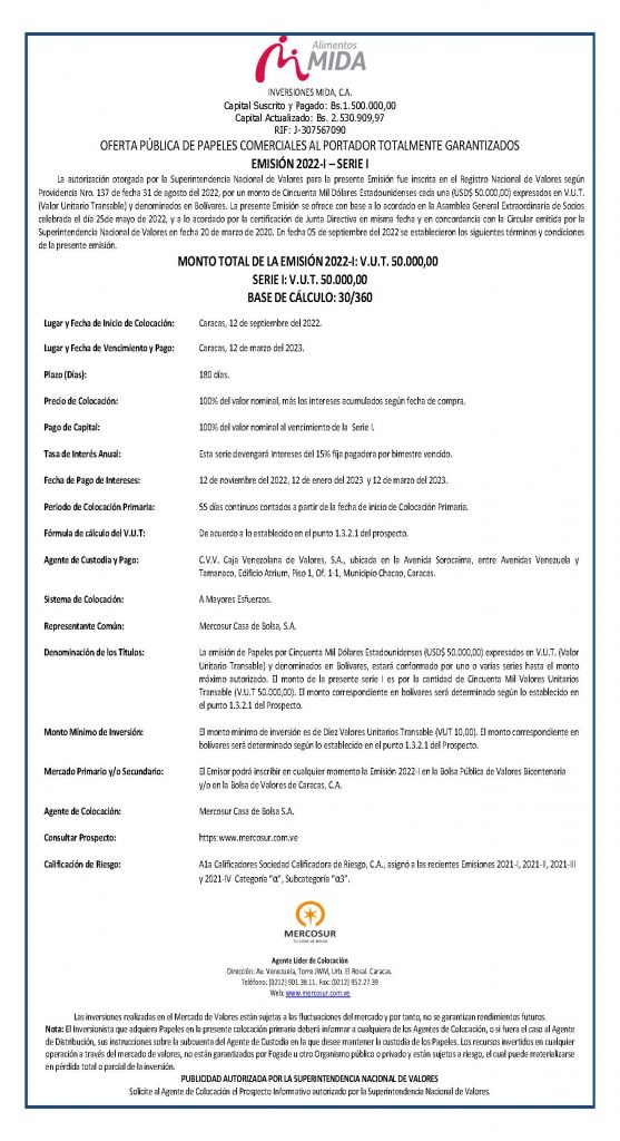 Colocación Primaria de Papeles Comerciales Emisión 2022-I Serie I Monto V.U.T. 50.000,00 c/u. Equivalentes a Bolívares, Emisión 2022-II Serie I Monto V.U.T. 50.000,00 c/u. Equivalentes a Bolívares.