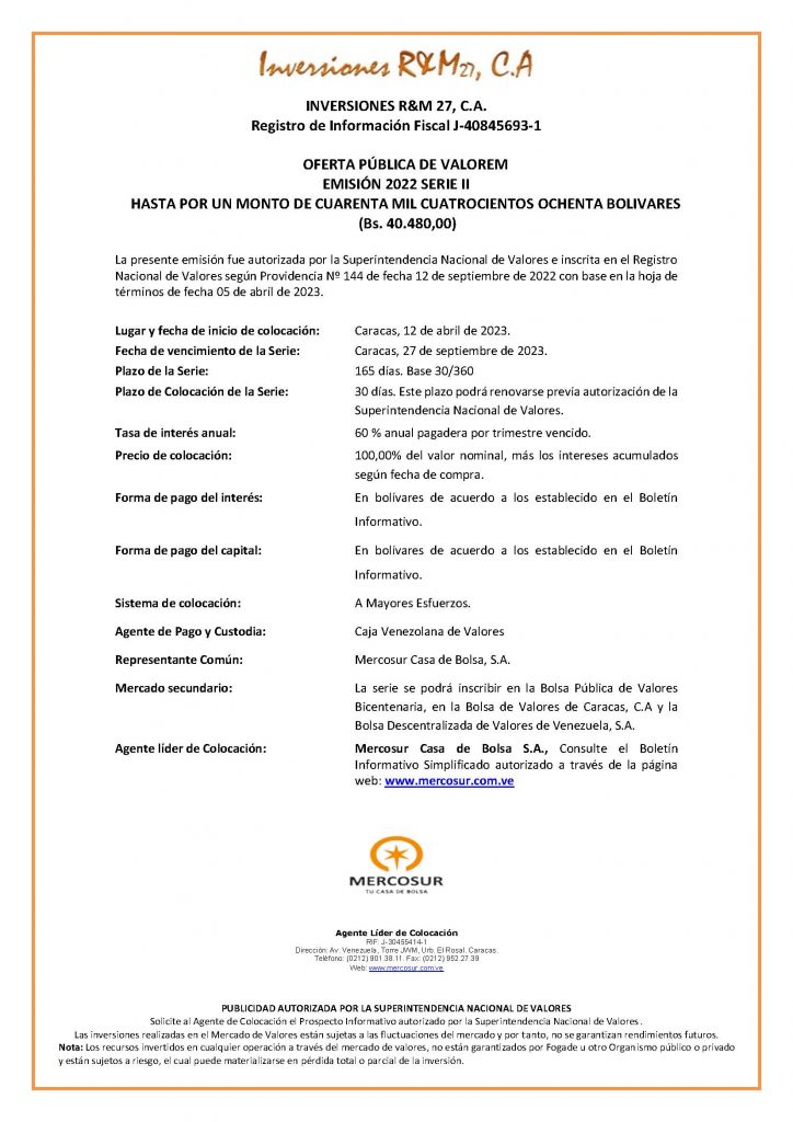 Los títulos para colocar son los correspondiente a la Serie II, de la Emisión 2022, de Valores de Emprendedores (VALOREM), de INVERSIONES R&M 27, C.A, con denominación en bolívares.