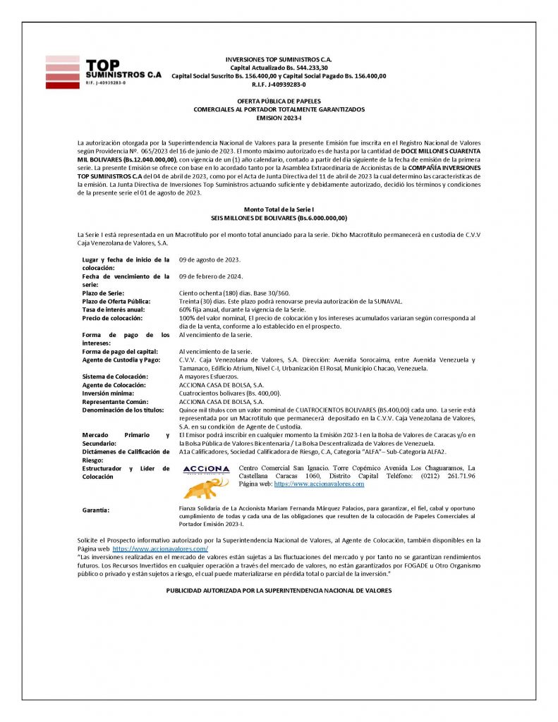 | Emisor | INVERSIONES TOP SUMINISTROS, C.A. |