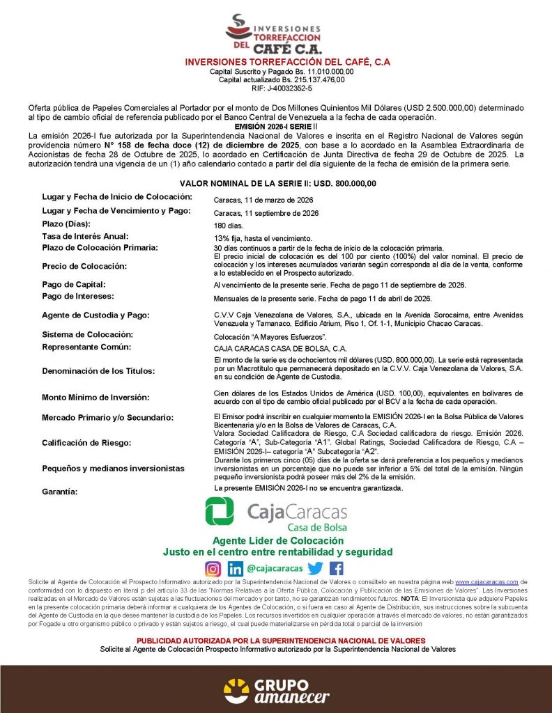 Los títulos para colocar son los correspondientes a la Serie II, de la Emisión 2026-I, de Papeles Comerciales de INVERSIONES TORREFACCIÓN DEL CAFÉ, C. A., con denominación en dólares de los Estados Unidos de América (USD$). Negociables y liquidables en bolívares.