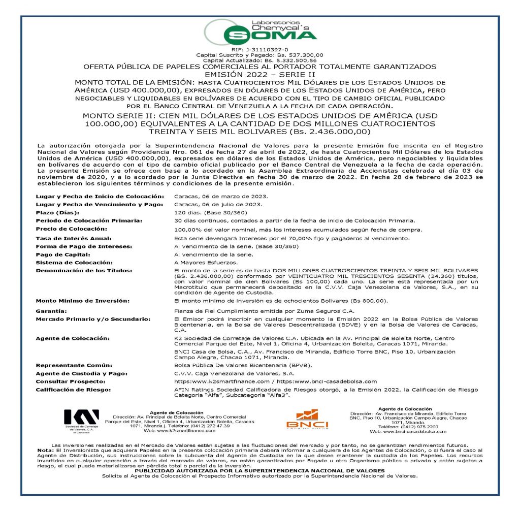 Los títulos para colocar son los correspondientes a las Serie II, de la Emisión 2022, de Papeles Comerciales al Portador, emitidos por la Empresa Emisora LABORATORIOS CHEMYCAL´S SOMA, C.A.