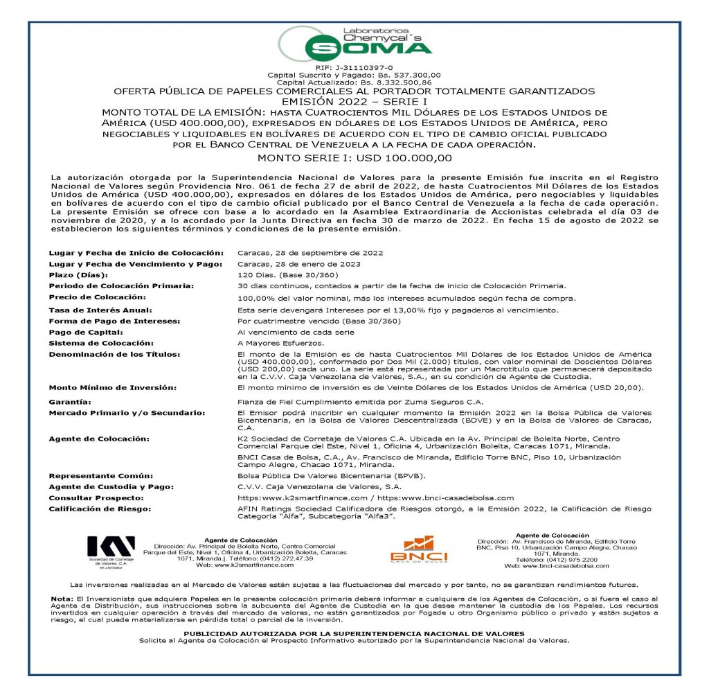 Los títulos para colocar son los correspondientes a la Serie I, Emisión 2022, de Papeles Comerciales al Portador, emitidos por la Empresa Emisora LABORATORIOS CHEMYCAL´S SOMA, C.A. por un monto de (USD$ 100.000,00), indexados.