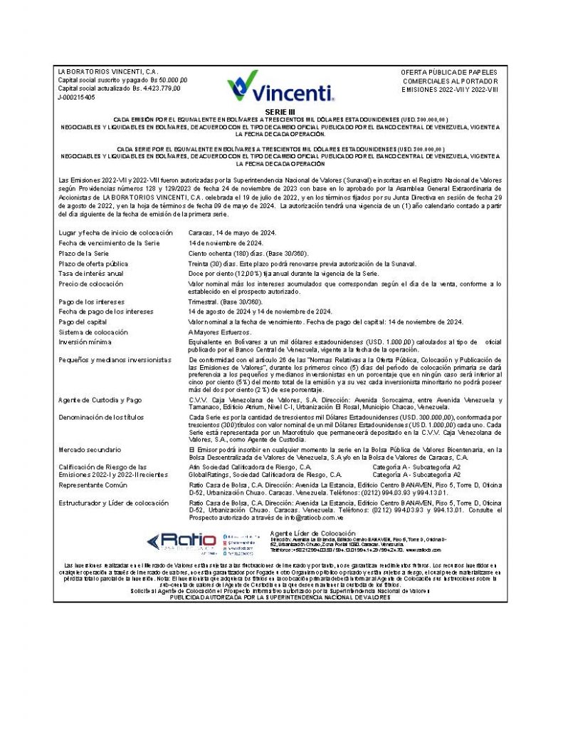 LABORATORIOS VINCENTI, C.A. EMISIÓN 2022-VII Y EMISIÓN 2022-VIII PAPELES COMERCIALES AL PORTADOR