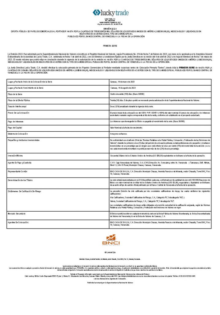 Los títulos para colocarse son los correspondientes a la Serie I, de la Emisión 2022-I, de Papeles Comerciales al Portador, emitidos por la Empresa Emisora LUCKY TRADE, C.A.