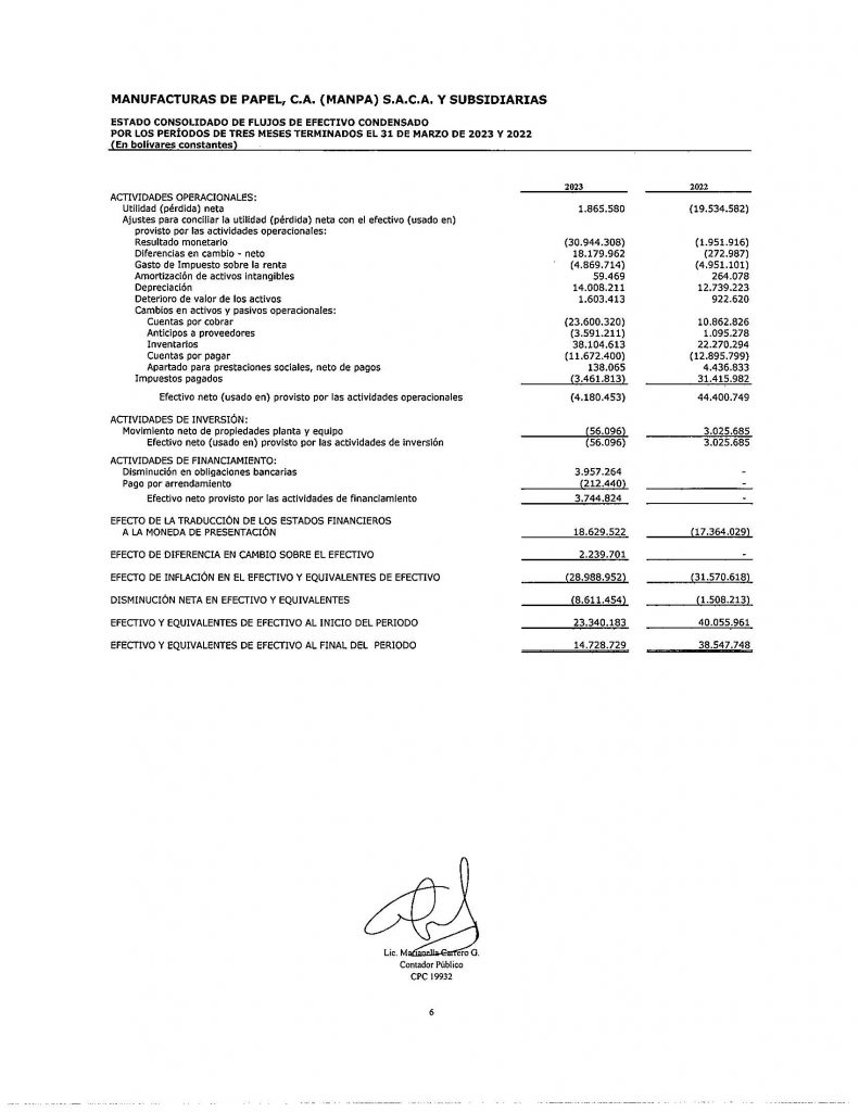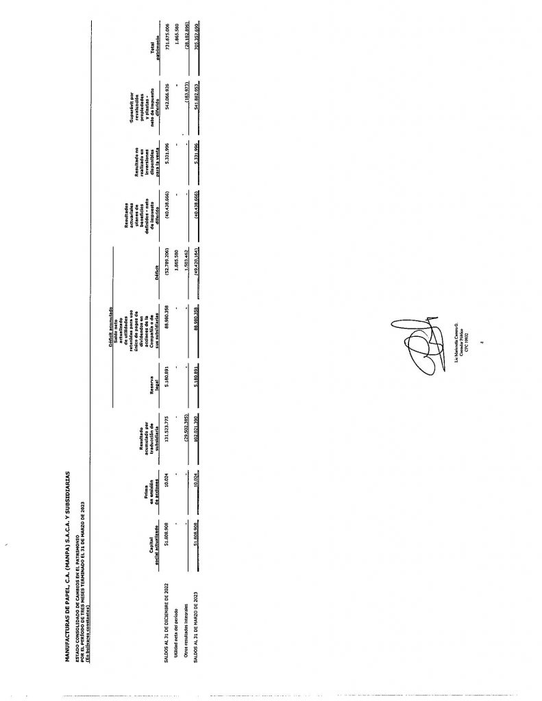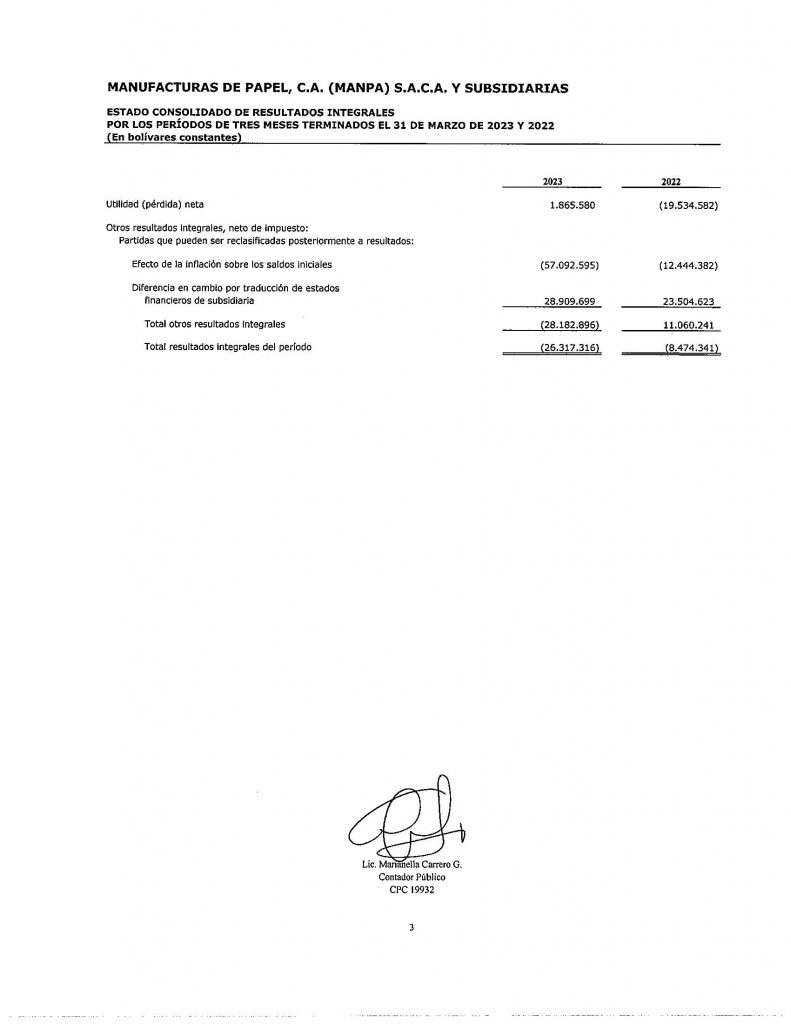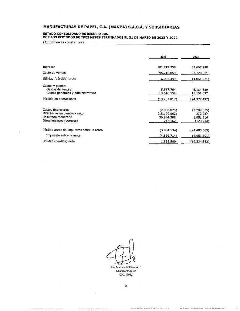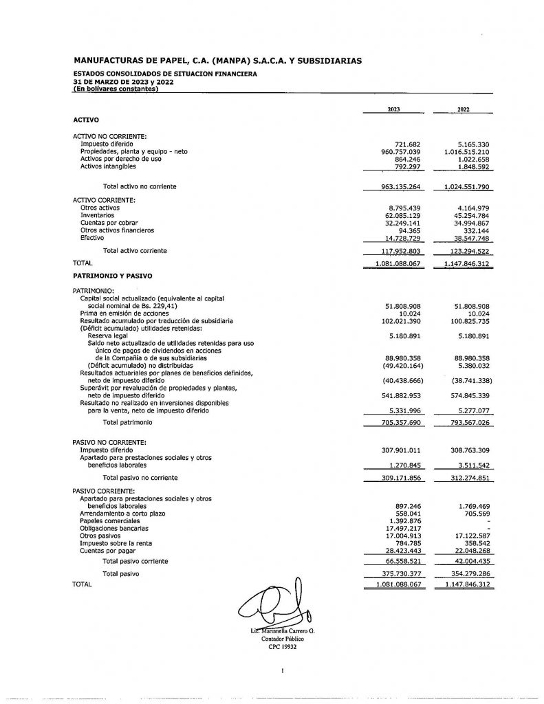 MANUFACTURAS DE PAPEL, C.A., (MANPA) S.A.C.A. Y SUBSIDIARIAS INFORMACIÓN FINANCIERA TRIMESTRAL MARZO 2023 Y 2022 (No Auditado)
