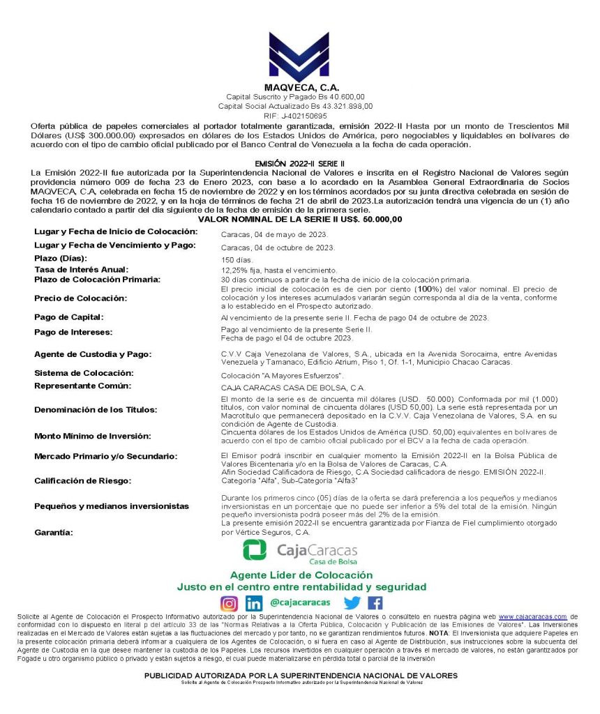 Los títulos para colocar son los correspondiente a la Serie II, de la Emisión 2022-II, de Papeles Comerciales al Portador, emitidos por la Empresa Emisora MAQVECA, C.A. por un monto de (US$ 50.000,00), indexados.
