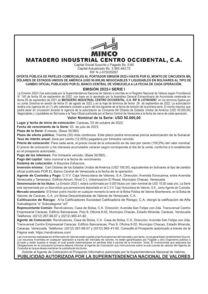 Colocación Primaria de Papeles Comerciales Emisión 2022-I Serie I Monto USD$ 50.000,00 Negociables y Liquidables en Bolívares a la Tasa Oficial publicada por el Banco Central de Venezuela a la fecha de cierre de cada operación.