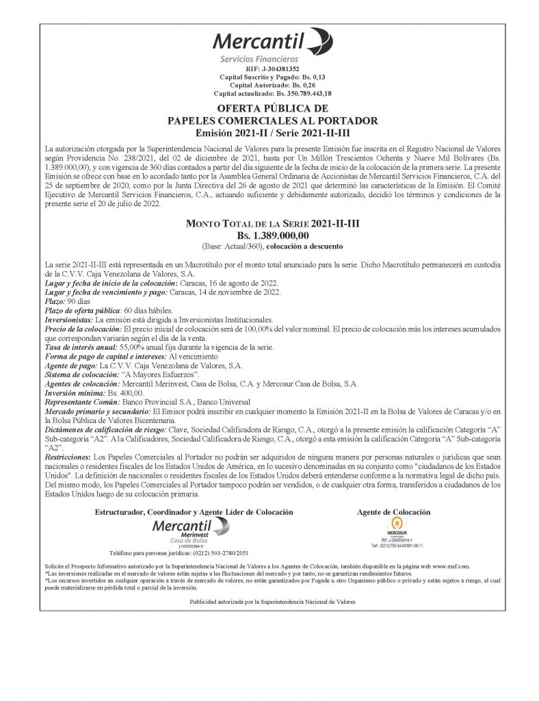 Los títulos para colocar son los correspondientes a la Serie 2021-II-III, Emisión 2021-II, de Papeles Comerciales al Portador, emitidos por la Empresa Emisora MERCANTIL SERVICIOS FINANCIEROS, C.A.
