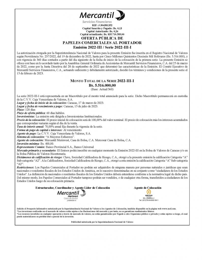 Los títulos para colocar son los correspondientes a la Serie 2022-III-I, Emisión 2022-III, de Papeles Comerciales al Portador, emitidos por la Empresa Emisora MERCANTIL SERVICIOS FINANCIEROS, C.A.