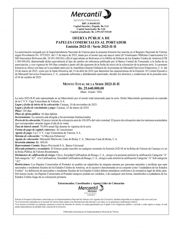 MERCANTIL SERVICIOS FINANCIEROS, C.A. EMISIÓN 2023-II SERIE 2023-II-II., PAPELES COMERCIALES AL PORTADOR