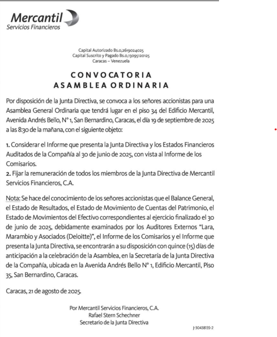 Por disposición de la Junta Directiva, se convoca a los señores accionistas para una Asamblea General Ordinaria que tendrá lugar en el piso 34 del Edificio Mercantil, Avenida Andrés Bello, N 1, San Bernardino, Caracas, el día 19 de septiembre de 2025 a las 8:30 de la mañana, con el siguiente objeto:
