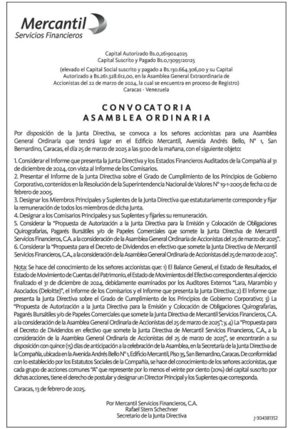 Nota: Se hace del conocimiento de los señores accionistas que, (i) el Balance General, el Estado de Resultados, el Estado de Movimiento de Cuentas del Patrimonio, el Estado de Movimientos del Efectivo correspondientes al ejercicio finalizado el 31 de diciembre de 2024, debidamente examinados por los Auditores Externos “Lara, Marambio y Asociados (Deloitte)”,2) el informe que presenta la junta directiva sobre el Grado de Cumplimiento de los Principios de Gobierno Corporativo; 3) la “Propuesta de Autorización a la Junta Directiva para la Emisión y Colocación de Obligaciones Quirografarias, Pagarés Bursátiles y/o de Papeles Comerciales y 4) La propuesta para el Decreto de Dividendos en efectivo que somete la Junta Directiva de Mercantil Servicios Financieros, C.A. a la consideración de la Asamblea General Ordinaria de Accionistas del 25 de marzo de 2025, se encontrarán a su disposición con quince (15) días de anticipación a la celebración de la Asamblea, en la Secretaria de la Junta Directiva de la Compañía, ubicada en la Avenida Andrés Bello Nro. 1 Edificio Mercantil, Piso 35, San Bernardino, Caracas. De conformidad con lo establecido por los Estatutos Sociales de la Compañía, se hace de conocimiento de los señores accionistas, que cada grupo de acciones comunes “A” que represente por lo menos por el 20% del capital suscrito por dichas acciones, tiene el derecho de postular y designar un Director Principal y los Suplentes que corresponda.