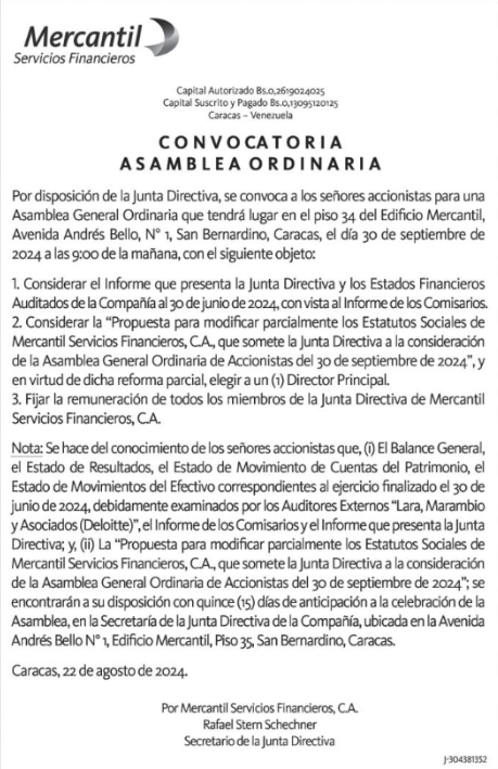 Nota: Se hace del conocimiento de los señores accionistas que, (i) el Balance General, el Estado de Resultados, el Estado de Movimiento de Cuentas del Patrimonio, el Estado de Movimientos del Efectivo correspondientes al ejercicio finalizado el 30 de junio de 2024, debidamente examinados por los Auditores Externos “Lara, Marambio y Asociados (Deloitte)”, el Informe de los Comisarios y el Informe que presenta la Junta Directiva, y (ii) la “Propuesta para modificar parcialmente los Estatutos Sociales de Mercantil Servicios Financieros, C.A., que somete la Junta Directiva a la consideración de la Asamblea General Ordinaria de Accionistas del 30 de septiembre de 2024” se encontrarán a su disposición con quince (15) días de anticipación a la celebración de la Asamblea, en la Secretaria de la Junta Directiva de la Compañía, ubicada en la Avenida Andrés Bello Nro. 1 Edificio Mercantil, Piso 35, San Bernardino. Caracas