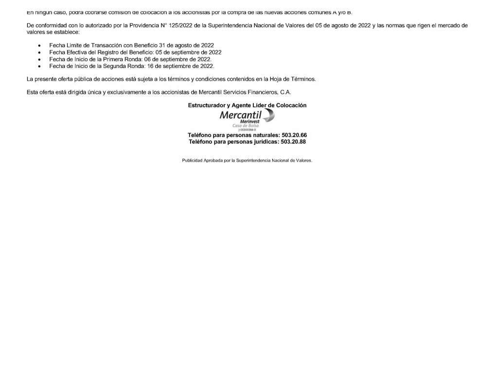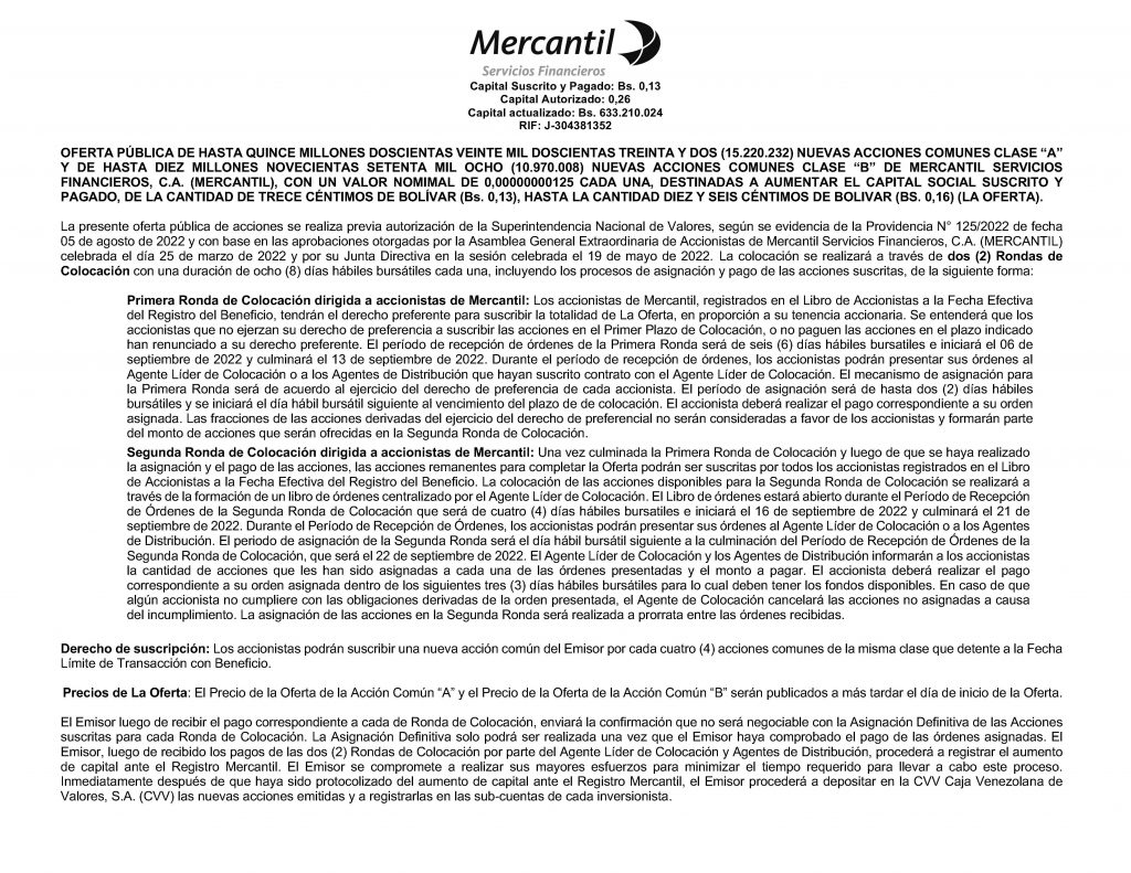 OFERTA PÚBLICA DE HASTA QUINCE MILLONES DOSCIENTAS VEINTE MIL DOSCIENTAS TREINTA Y DOS (15.220.232) NUEVAS ACCIONES COMUNES CLASE “A” Y DE HASTA 10.970.008 NUEVAS ACCIONES COMUNES CLASE “B” DE MERCANTIL SERVICIOS FINANCIEROS, C.A. (MERCANTIL), CON UN VALOR NOMIMAL DE 0,00000000125 CADA UNA, DESTINADAS A AUMENTAR EL CAPITAL SOCIAL SUSCRITO Y PAGADO, DE LA CANTIDAD DE Bs. 0,13, HASTA LA CANTIDAD BS. 0,16 (LA OFERTA).
