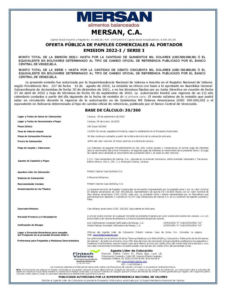 Los títulos para colocar son los correspondientes a la Serie I, de la Emisión 2022-I, de Papeles Comerciales, emitidos por la Empresa Emisora MERSAN, C.A.