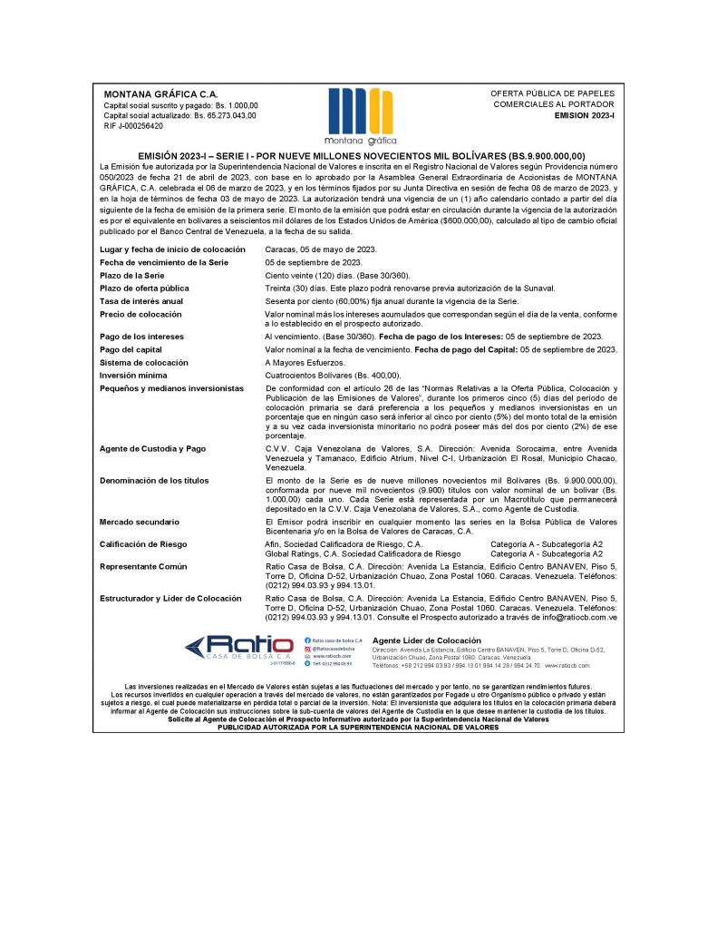 Los títulos para colocar son los correspondientes a la Serie I, por un monto de Bs. 9.900.000,00, de la Emisión 2023-I, de Papeles Comerciales al Portador, de la Empresa Emisora MONTANA GRÁFICA, C.A.