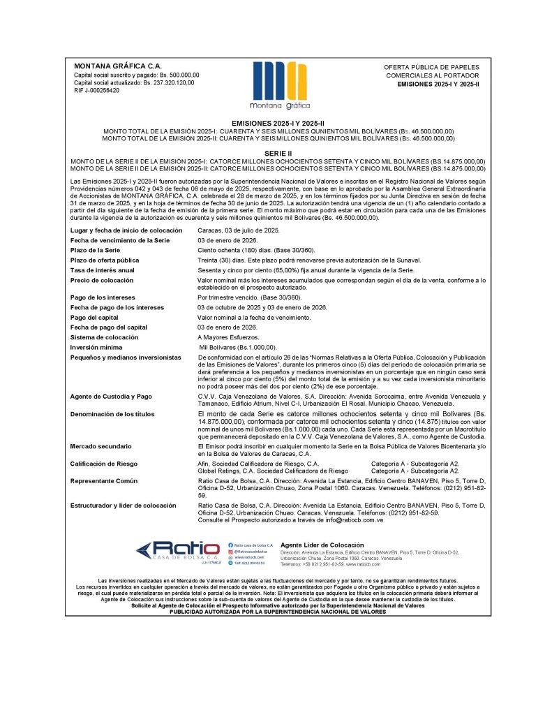 MONTANA GRÁFICA, C.A., EMISIÓN 2025-I SERIE II Y EMISIÓN 2025-II SERIE II, PAPELES COMERCIALES AL PORTADOR