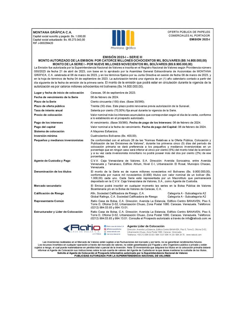 Los títulos para colocar son los correspondientes a la Serie III, de la Emisión 2023-I, de Papeles Comerciales al Portador, de la Empresa Emisora MONTANA GRÁFICA, C.A.