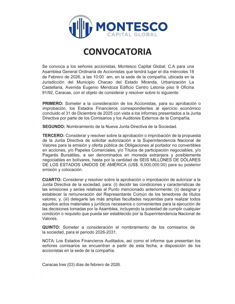 Se convoca a los señores accionistas de Montesco Capital Global CA para una Asamblea General Ordinaria de Accionistas que tendrá lugar el día miércoles 18 de febrero de 2026, a las 10 am, en la sede de la compañía, ubicada en la jurisdicción del Municipio Chacao del Estado Miranda, Urbanización la Castellana Avenida Eugenio Mendoza Edificio Centro Letonia piso 9 Oficinas 91 y 92, Caracas, con el objeto de considerar y resolver sobre lo siguiente: