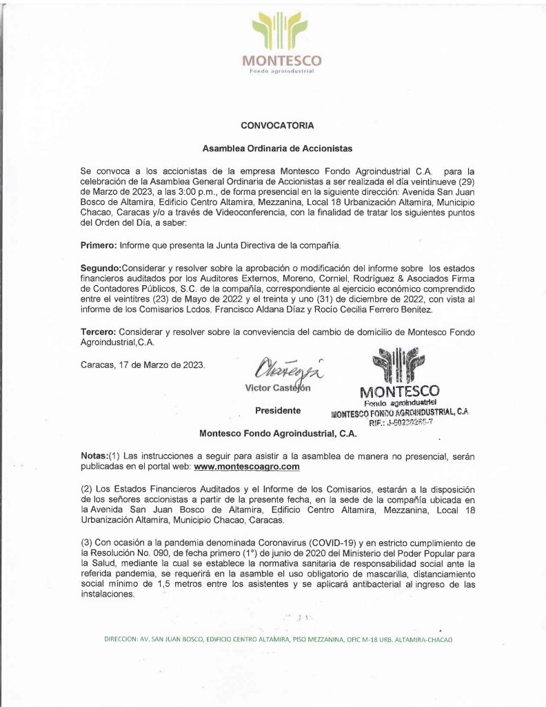 Se convoca a los accionistas de la empresa Montesco Fondo Agroindustrial C.A. para la celebración de la Asamblea General Ordinaria de Accionistas a ser realizada el día veintinueve (29) de Marzo de 2023, a las 3:00 p.m., de forma presencial en la siguiente dirección: Avenida San Juan Bosco de Altamira, Edificio Centro Altamira, Mezzanina, Local 1B Urbanización Altamira, Municipio Chacao, Caracas y/o a través de Videoconferencia, con la finalidad de tratar los siguientes puntos del Orden del Día, a saber: