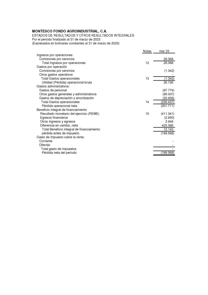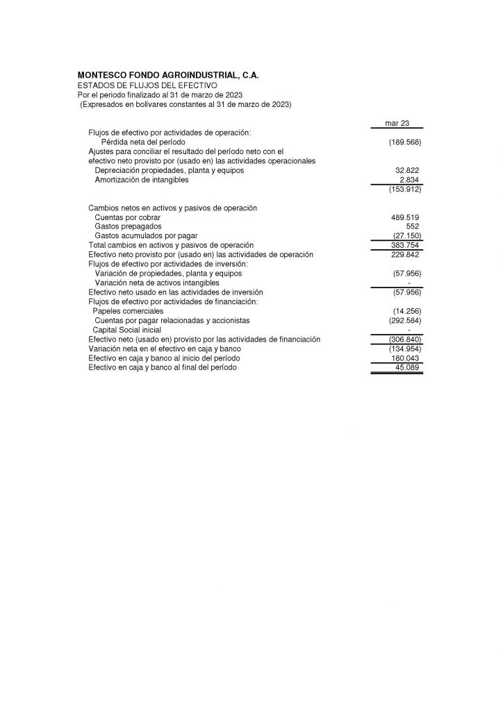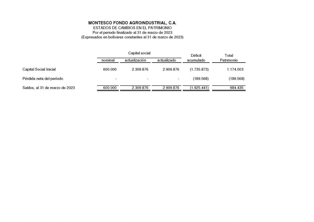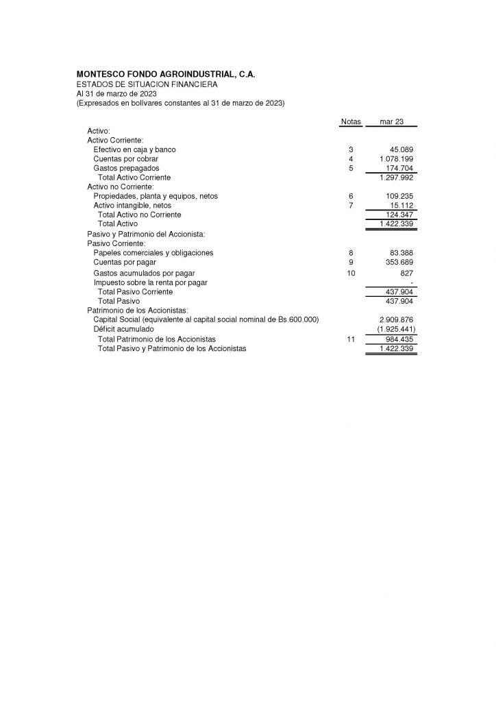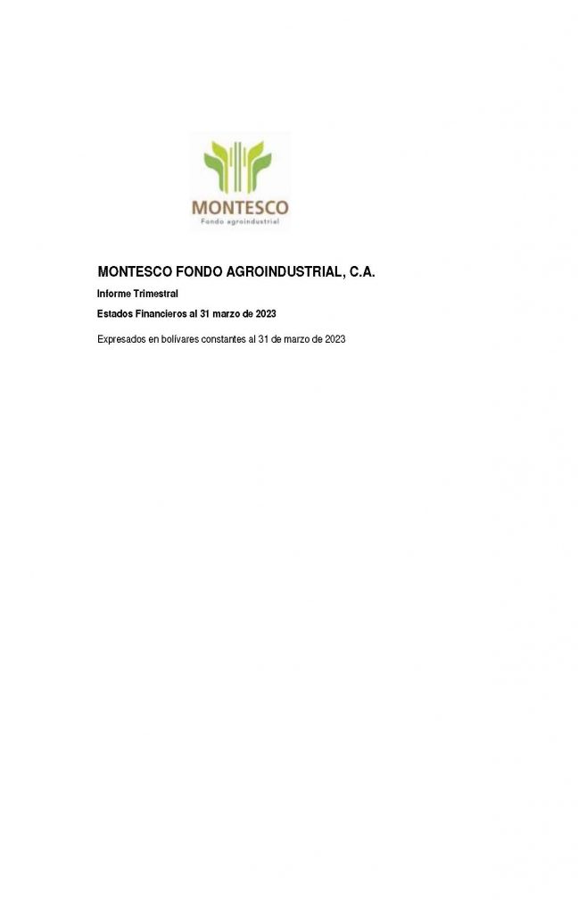 MONTESCO FONDO AGROINDUSTRIAL C.A., INFORMACIÓN FINANCIERA TRIMESTRAL MARZO 2023 (No Auditado)