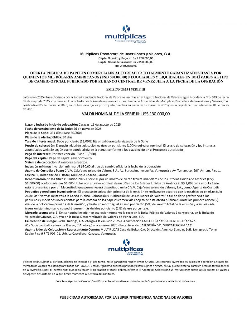 Colocación Primaria de Papeles Comerciales al Portador Totalmente Garantizados Emisión 2025-I Serie III Monto USD$ 130.000,00 NEGOCIABLES Y LIQUIDABLES EN BOLÍVARES AL TIPO DE CAMBIO OFICIAL PUBLICADO POR EL BANCO CENTRAL DE VENEZUELA A LA FECHA DE LA OPERACIÓN