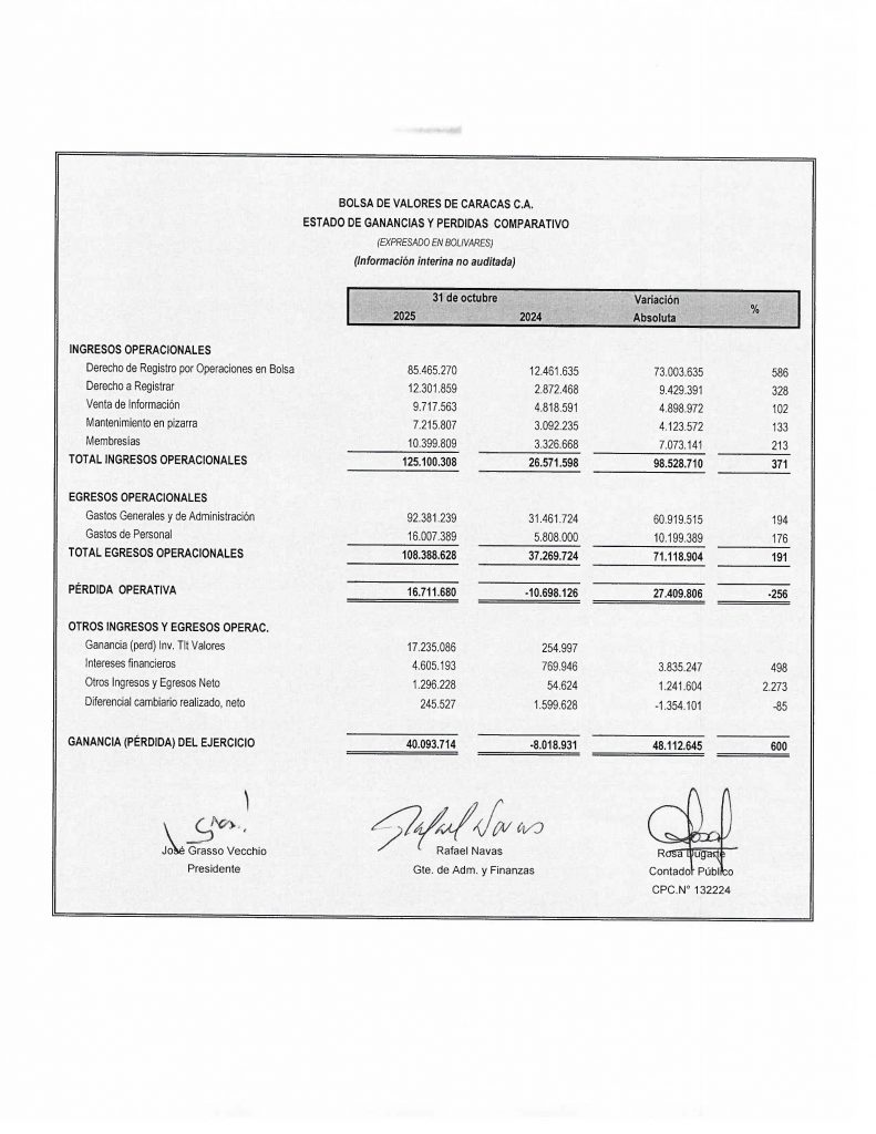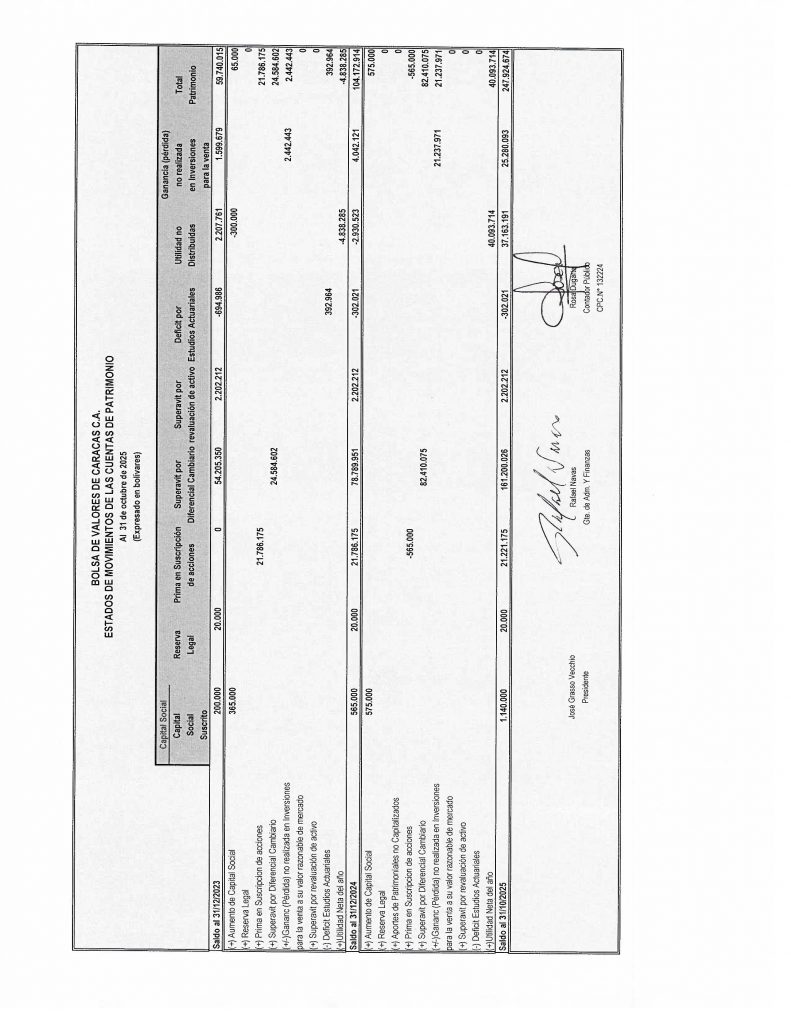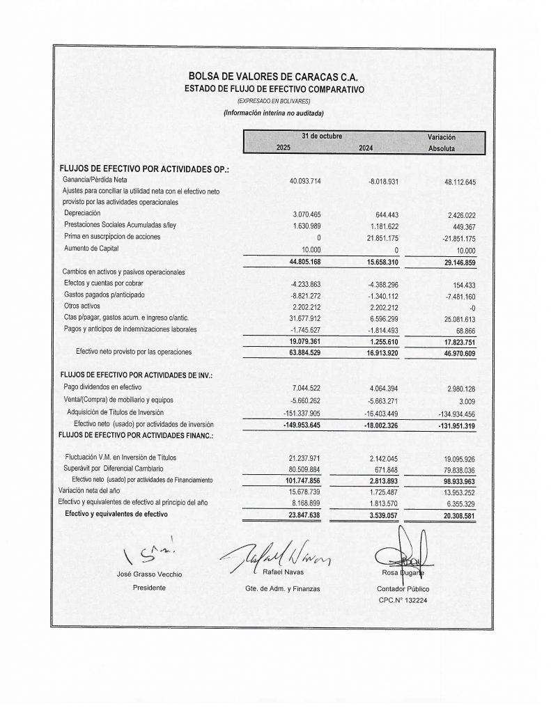 Balance General, Estado de Ganancias y Pérdidas, Estado de Movimiento de las Cuentas del Patrimonio, Estado de Flujo de Efectivo e índices financieros al 31 de Octubre de 2025 comparativo con el 31 de Octubre de 2024 del emisor Bolsa de Valores de Caracas C.A