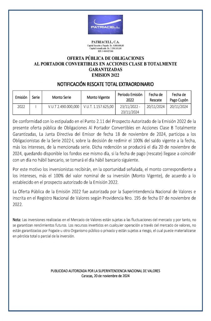 De conformidad con lo estipulado en el Punto 2.11 del Prospecto Autorizado de la Emisión 2022 de la presente oferta pública de Obligaciones Al Portador Convertibles en Acciones Clase B Totalmente Garantizadas, La Junta Directiva del Emisor de fecha 18 de noviembre de 2024, participa a los Obligacionistas de la Serie 2022-I, sobre la decisión de redimir el 100% del saldo vigente a la fecha, más los intereses, de la mencionada serie. Dicha redención se producirá el día 20 de noviembre de 2024, quedando disponible los fondos ese mismo día, si la fecha de pago (rescate) llegase a coincidir con un día no hábil bancario, se tomará el día hábil bancario siguiente.