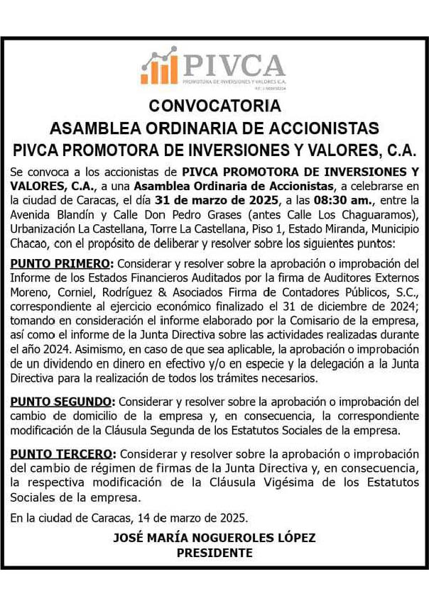 Se convoca a los accionistas de PIVCA PROMOTORA DE INVERSIONES Y VALORES C.A., a una Asamblea Ordinaria de Accionistas, a celebrarse en la ciudad de Caracas, el día 31 de marzo de 2025, a las 8:30 am, en la Avenida Blandin y Calle Don Pedro Grases (antes calle los Chaguaramos), Urbanización la Castellana, torre la Castellana, Piso 1, Municipio Chacao, Estado Miranda, con el propósito de deliberar y resolver sobre los siguientes puntos: