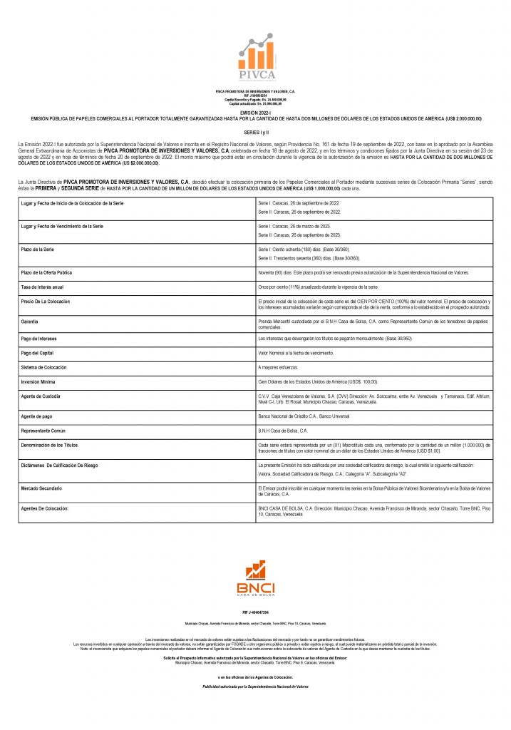 PIVCA PROMOTORA DE INVERSIONES Y VALORES, C. A. Emisión 2022-I Serie I Monto USD$ 1.000.000,00 y Emisión 2022-I Serie II Monto USD$ 1.000.000,00