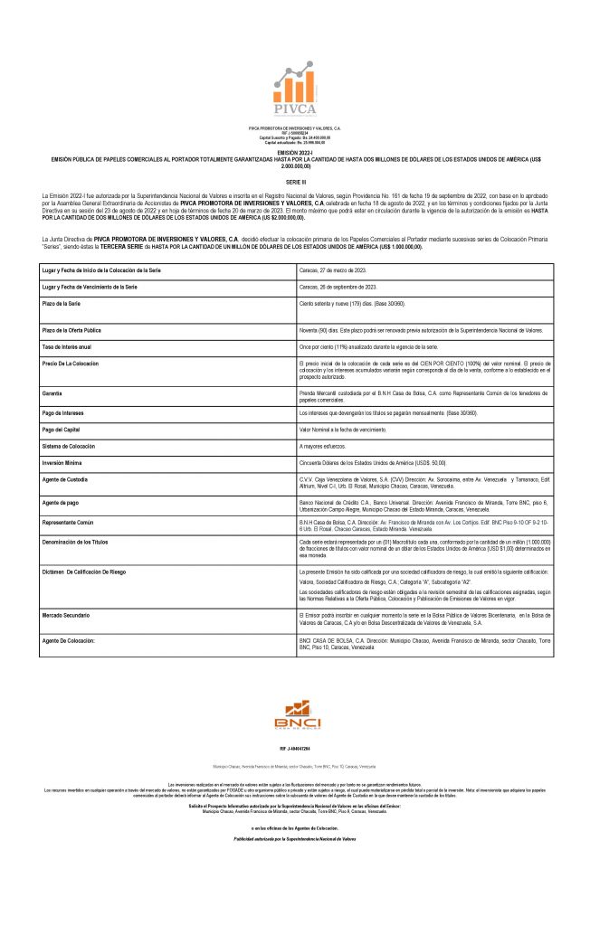 Los títulos para colocar son los correspondiente, a la Serie III, de la Emisión 2022-I, de Papeles Comerciales al Portador, emitidos por la Empresa Emisora PIVCA PROMOTORA DE INVERSIONES Y VALORES, C.A. por un monto de (USD$ 1.000.000,00).