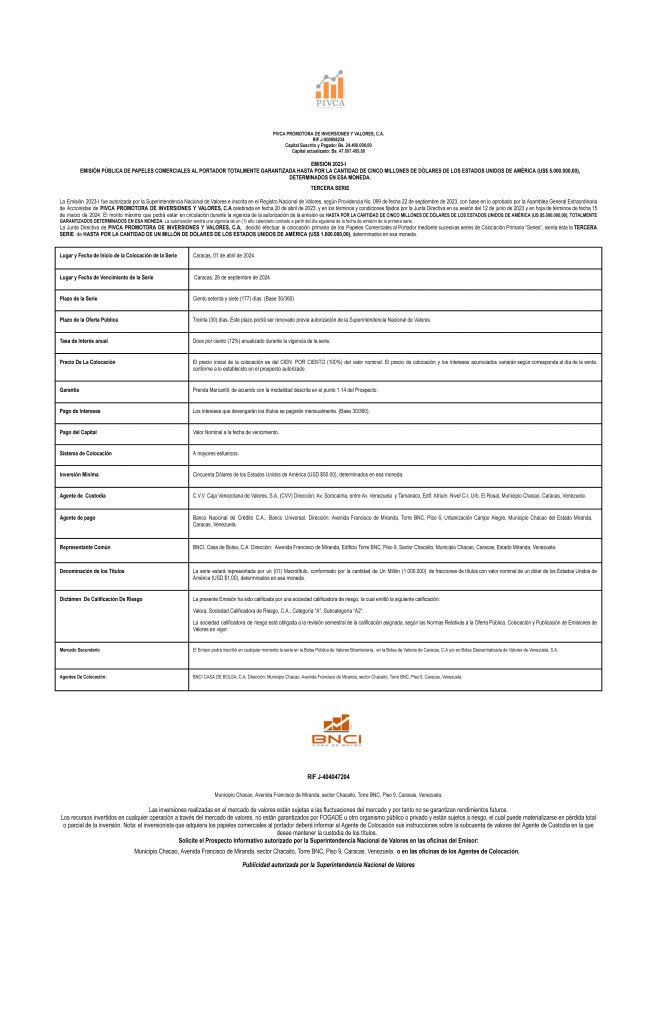 Los títulos para colocar son los correspondiente, a la Serie III, de la Emisión 2023-I, de Papeles Comerciales al Portador, emitidos por la Empresa Emisora PIVCA PROMOTORA DE INVERSIONES Y VALORES, C.A. por un monto de (USD$ 1.000.000,00). .