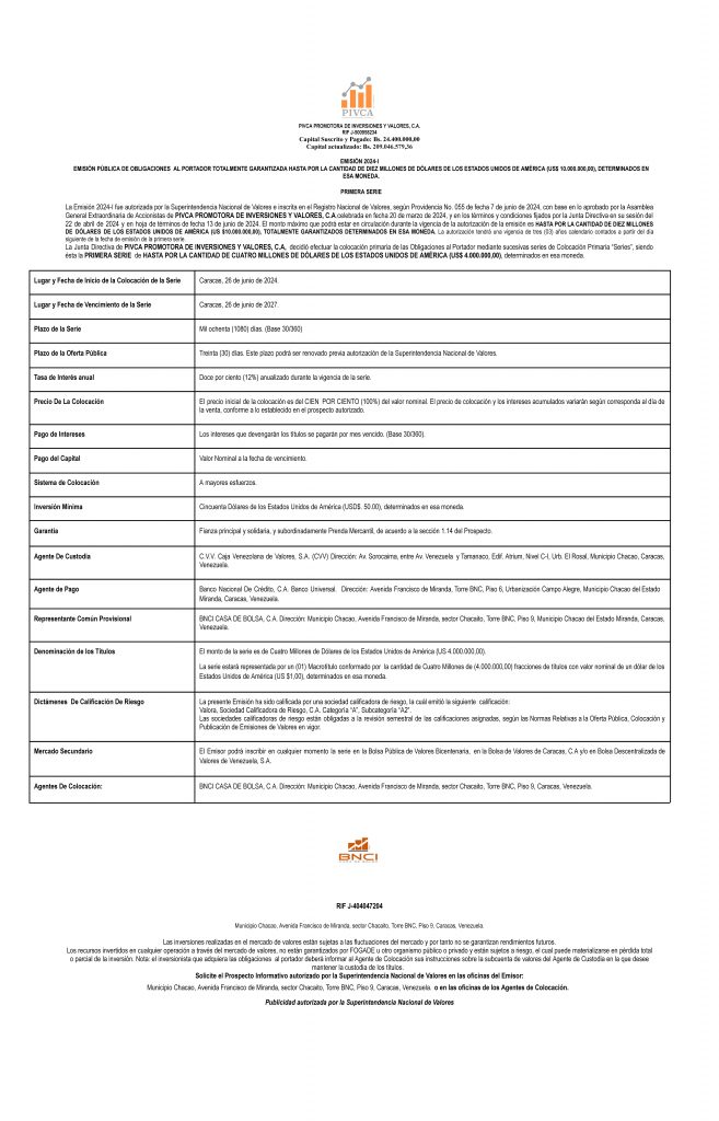 Los títulos para colocar son los correspondiente, a la Serie I, de la Emisión 2024-I, de Obligaciones al Portador Totalmente Garantizadas, emitidas por la Empresa Emisora PIVCA PROMOTORA DE INVERSIONES Y VALORES, C.A. por un monto de (USD$ 4.000.000,00).